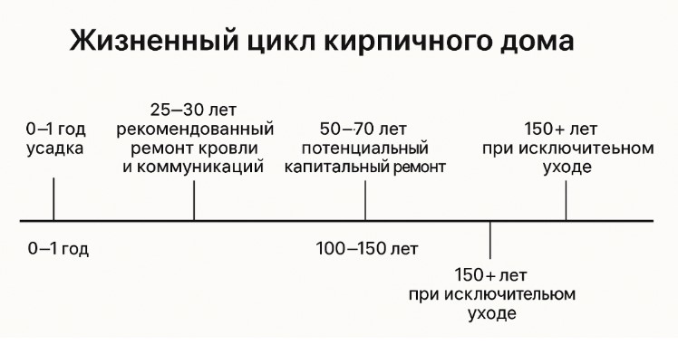 Разница между ресурсом несущей «коробки» и инженерных систем действительно существенна: кирпичные стены при корректной эксплуатации способны служить 100–150 лет и более, тогда как инженерные сети обычно требуют замены каждые 15–30 лет; при этом заявления о «300 годах» для обычных жилых домов некорректны — исторические примеры долговечности свыше 200 лет обусловлены регулярными капитальными ремонтами и реставрациями, а не непрерывной безремонтной эксплуатацией.