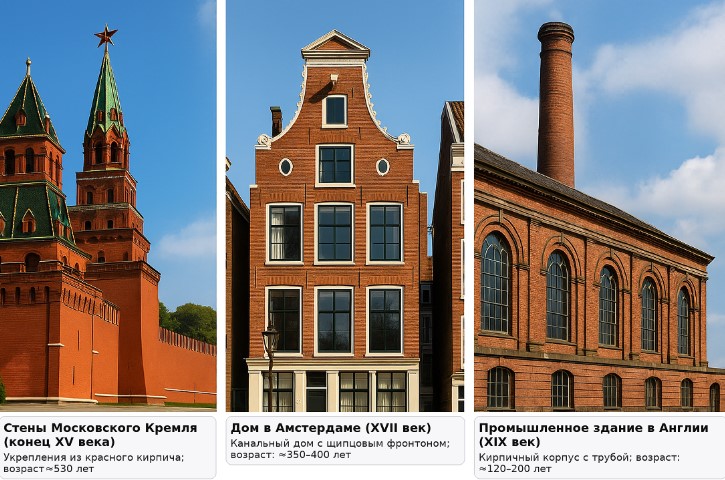 Реальный срок службы кирпичных зданий часто превышает нормативный, что доказывают исторические постройки. Стены Московского Кремля, возведенные в конце XV века, стоят более 500 лет благодаря качеству материала и постоянной реставрации. Дома в Амстердаме XVII века служат более 300 лет, а промышленные здания в Англии XIX века - 150-200 лет. Опыт эксплуатации показывает, что такие примеры долговечности - результат использования качественных материалов и регулярных ремонтов. Подобные исторические здания наглядно демонстрируют, сколько лет стоит кирпичный дом при правильном подходе к его сохранению.
